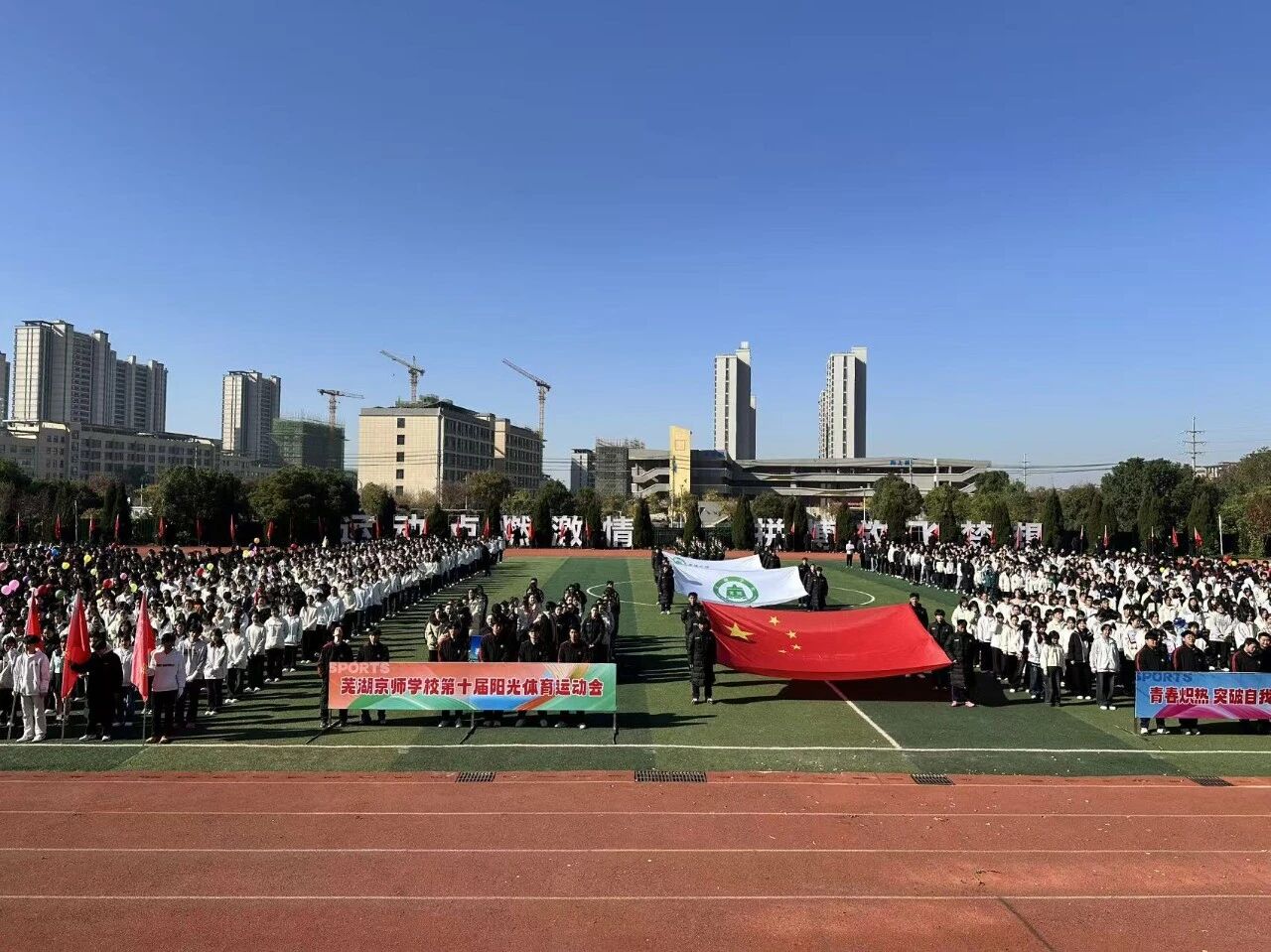 2025年11月26日,冬阳正好,虹门高张,彩旗招展,气氛热烈,芜湖京师学校第十届阳光体育运动会在东校区田径场隆重开幕。京师各校区全体师生欢聚绿茵场上,共赴这场五育并举的盛会。湾沚区教育局、文旅体局、共青团湾沚区委员会、湾沚派出所等单位领导,一中、实验学校、东湖学校、南湖学校、沚津学校等二十余所学校校长,京师中教集团董事长吕向东、李总顾问及京师学校校务会成员莅临现场,宾主济济一堂,共同见证京师体育盛事。